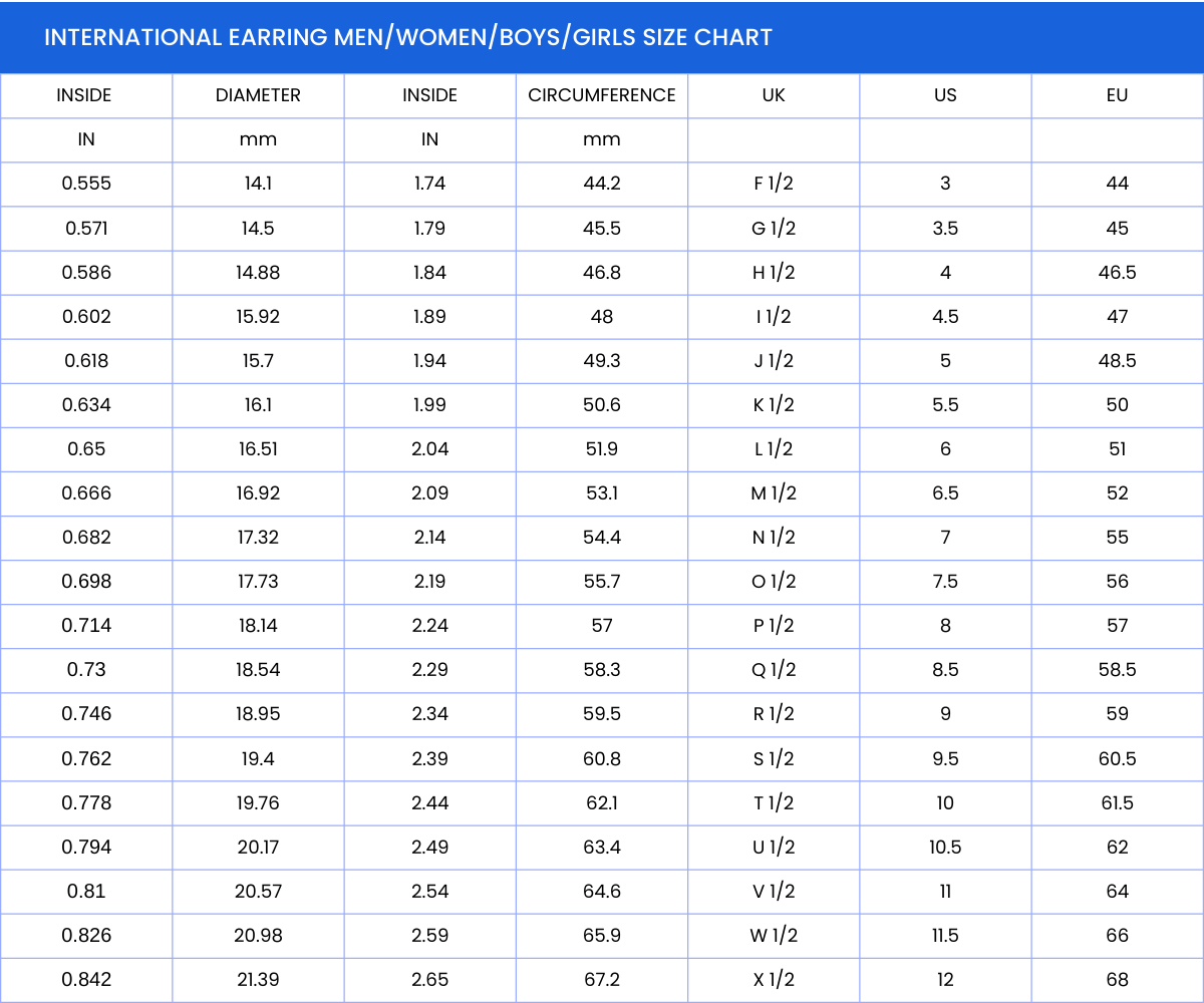 Earrings size | EU 44, EU 45, EU 46.5, EU 47, EU 48.5, EU 50, EU 51, EU 52, EU 55, EU 56, EU 57, EU 58.5, EU 59, EU 60.5, EU 61.5, EU 62, EU 64, EU 66, EU 68 |