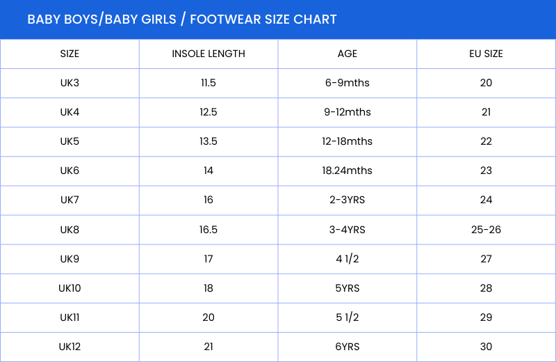 | Baby Footwear Sizes | EU 20, EU 21, EU 22, EU 23, EU 24, EU 25-26, EU 27, EU 28, EU 29, EU 30 |
